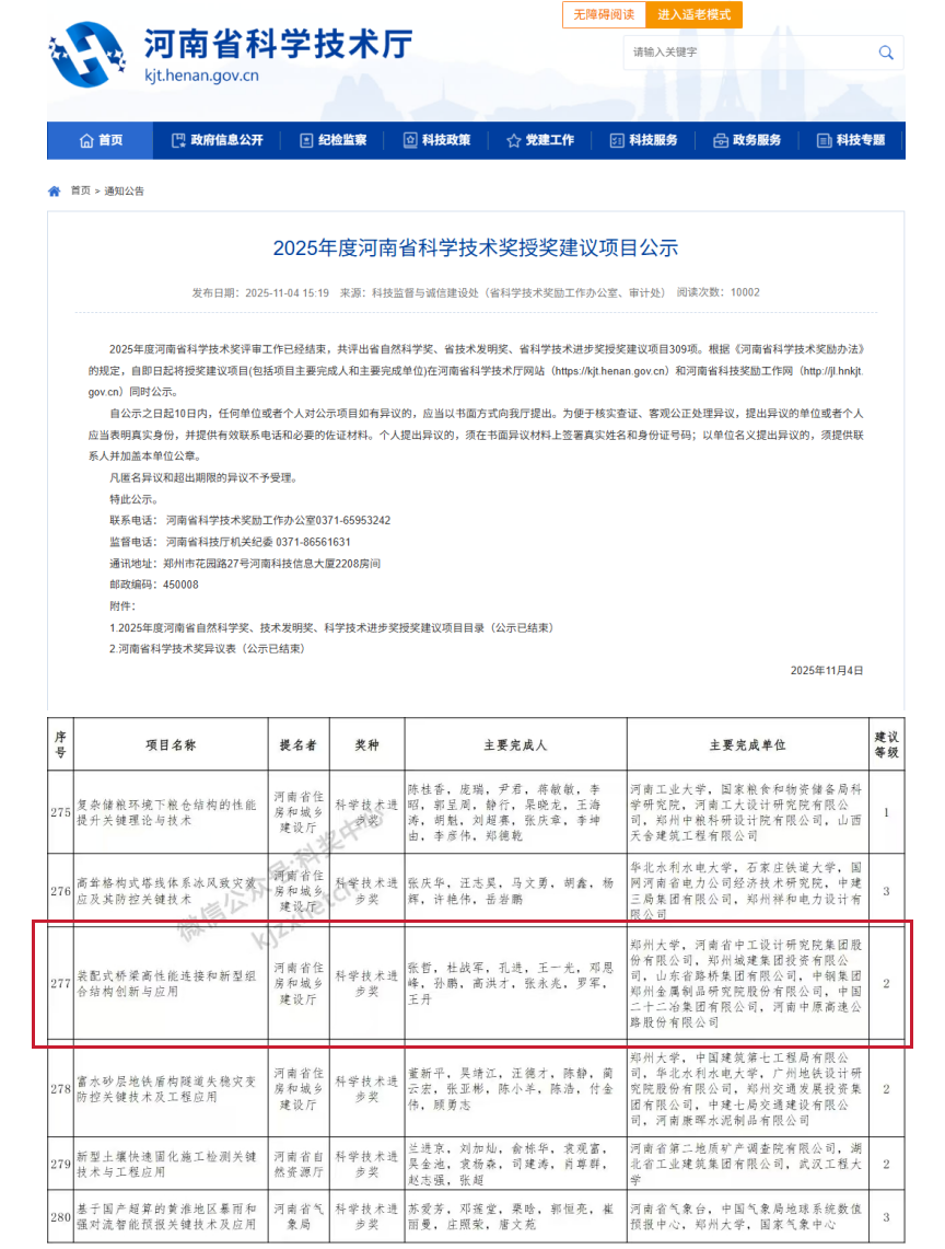 近日,山東公司裝配式橋梁高性能連接和新型組合結構創新與應用獲河南省科學技術進步獎二等獎。 公司聚焦橋梁基礎設施建設領域,圍繞裝配式橋梁連接材料、連接技術、主梁性能以及服役安全四方面技術瓶頸,與鄭州大學聯合研發了裝配式橋梁高性能連接技術和新型組合結構體系。通過研發機制砂UHPC、R-UHPC、鐵尾礦砂灌漿料等新型高性能連接材料,解決了傳統連接材料耐久性差、早期強度低等問題,實現了免蒸養條件下橋梁聯結部位的快速建造。